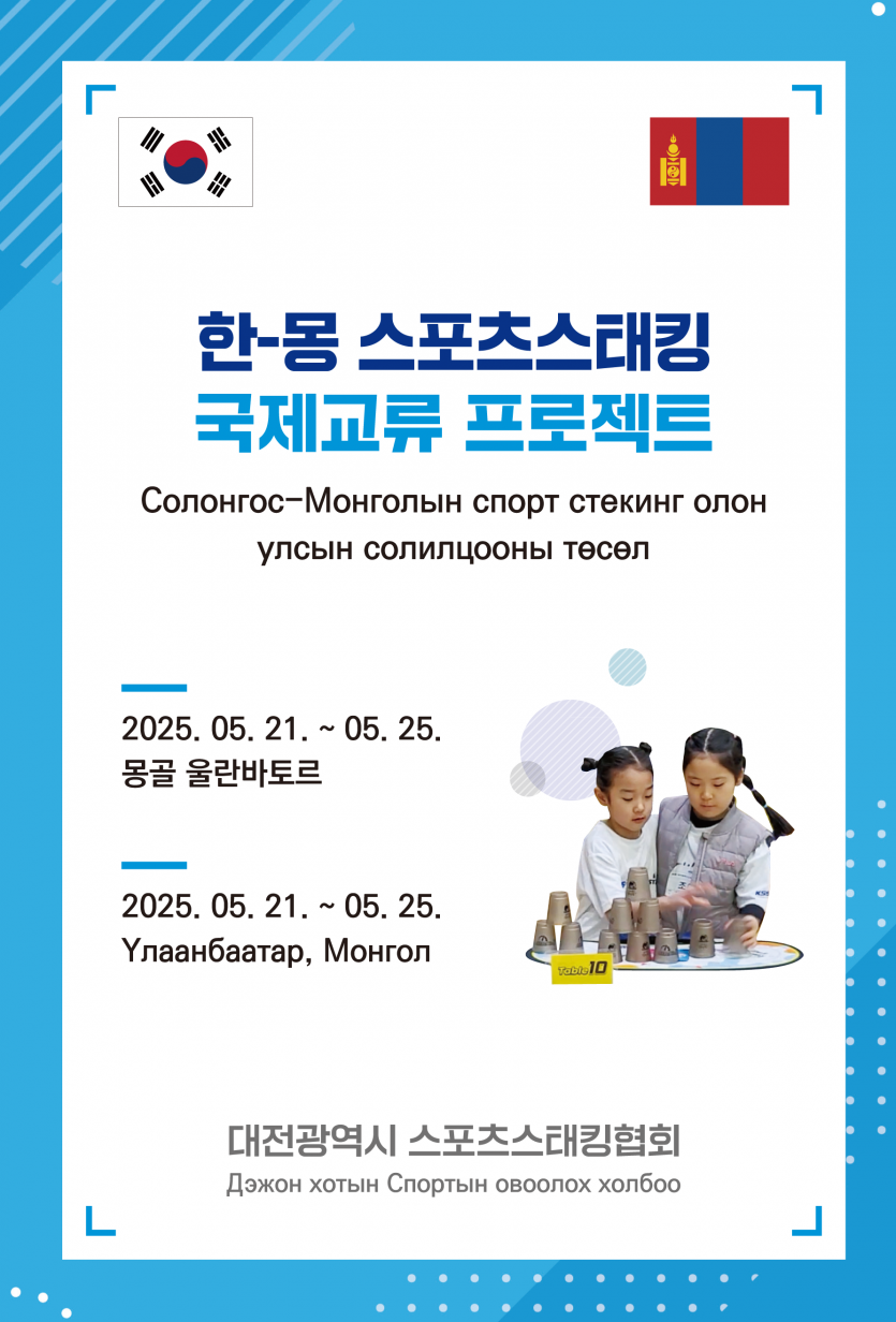 대전광역시스포츠스태킹협회(회장: 김동건)는 오는 2025년 5월 21일부터 26일까지, 몽골 울란바토르 현지에서 몽골스포츠스태킹협회, 후레대학교, 톨가학교와 함께 ‘한국-몽골 스포츠스태킹 국제교류 프로젝트’를 진행할 예정이다.